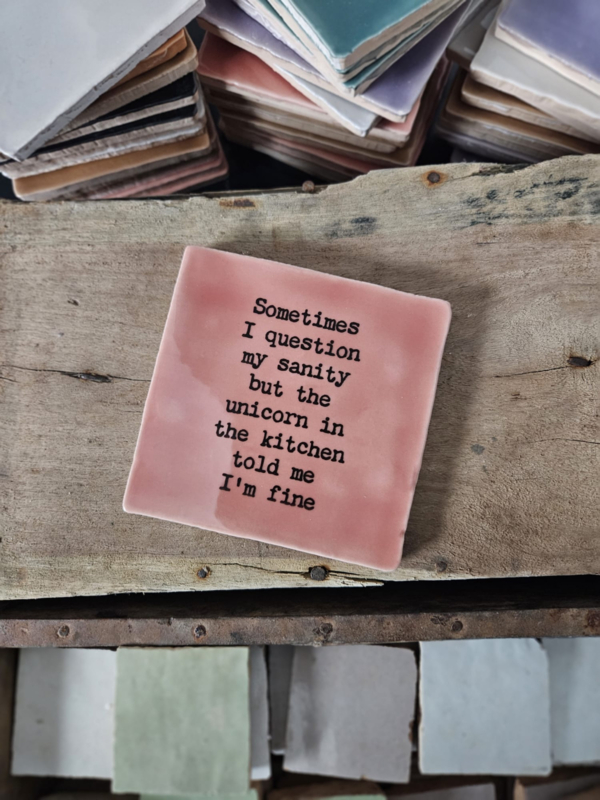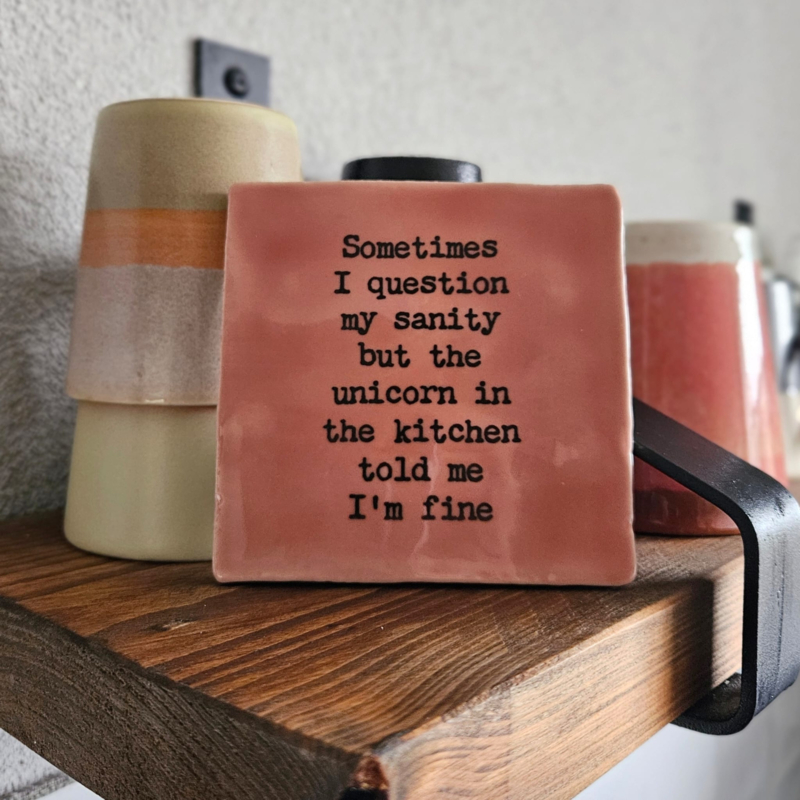 - Tegeltje met de tekst: Sometimes I question my sanity but the unicorn in the kitchen told me I'm fine
