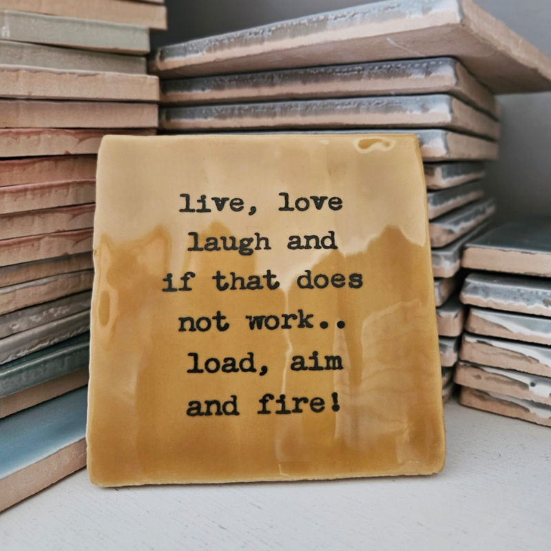 - Tegeltje met de tekst: Live, love laugh and if that does not work load, aim and fire!