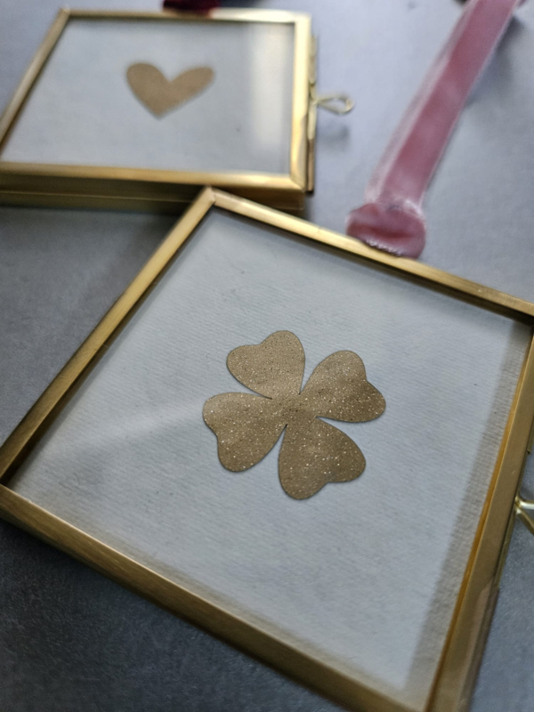 Minihanger van messing met een glitterhartje of klavertje 4 op katoenpapier of parelmoerpapier