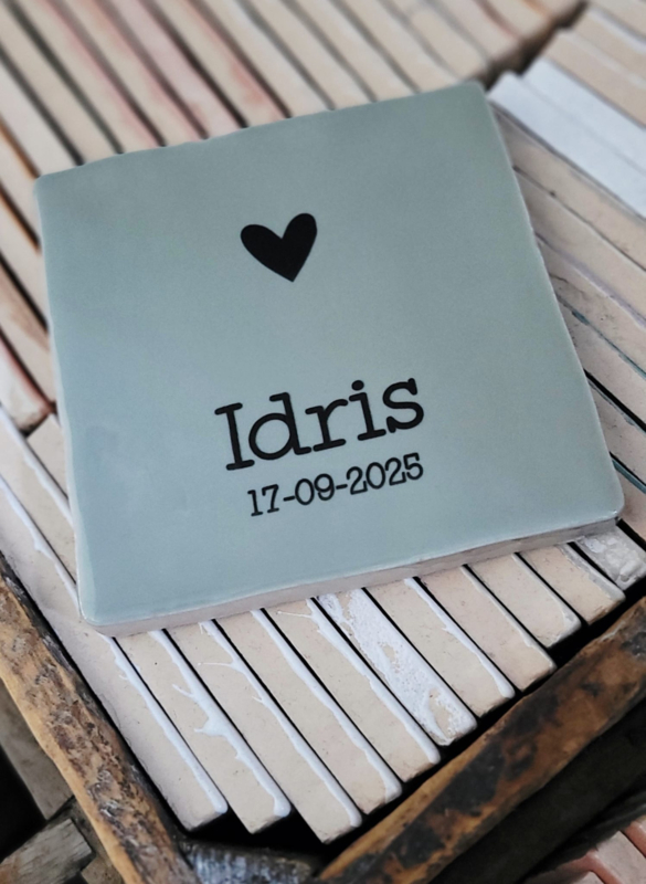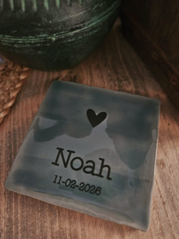 Gepersonaliseerd tegeltje met naam en datum. Kan goed bij geboorte, maar ook als gedenktegeltje bij overlijden.