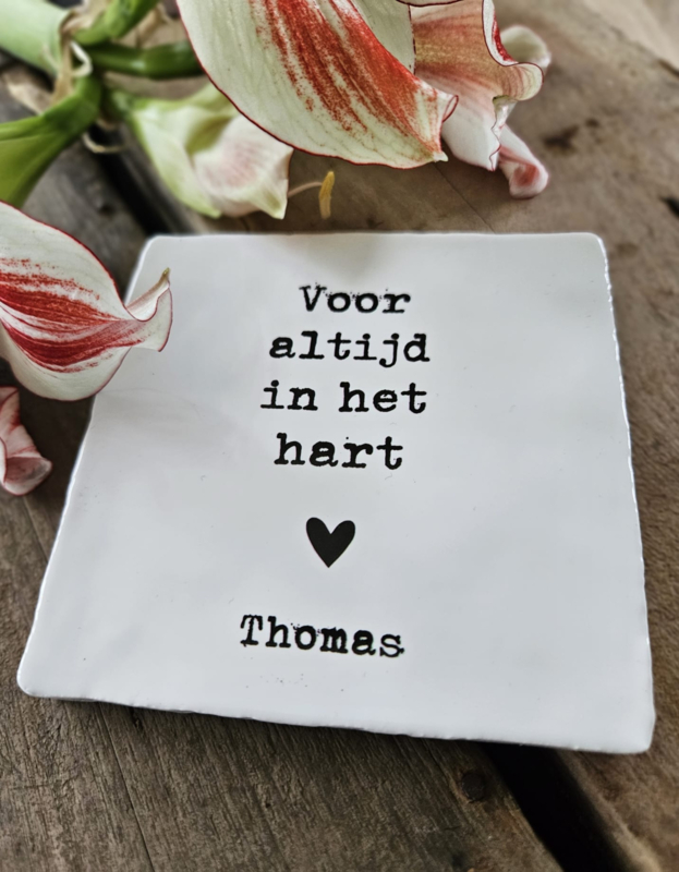 - Tegeltje met de tekst: Voor altijd in het hart ; te personaliseren met naam en datum of tekst